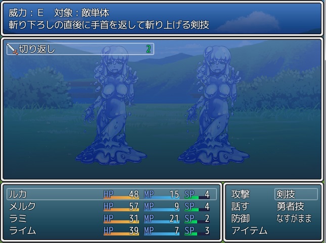 そして「攻撃」を行うと1、「防御」を行うと2、SPが回復する。 武技を用いて消費したSPは、「攻撃」や「防御」で溜めるということじゃ。 |